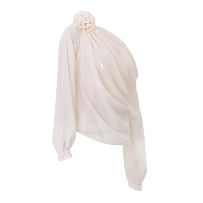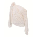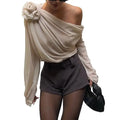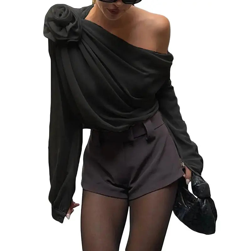 Make a breathtaking entrance in this sophisticated off-shoulder blouse , featuring dramatic asymmetrical draping and delicate ruching for a luxurious, body-conscious silhouette. The flowy chiffon fabric and long sleeves create a perfect balance between sexy and refined.